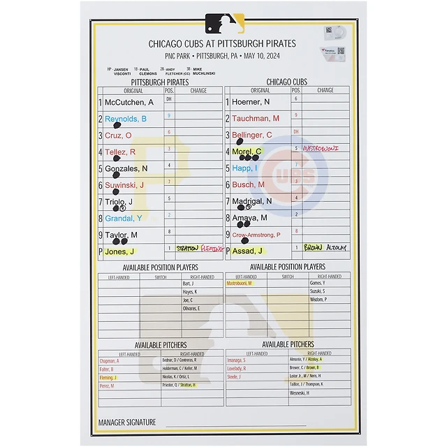 Pittsburgh Pirates Game-Used Lineup Card vs. Chicago Cubs on May 10, 2024