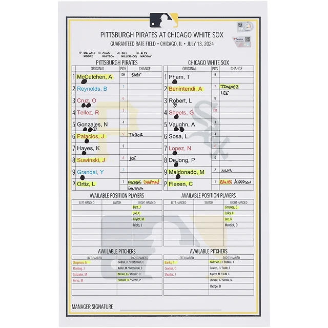 Pittsburgh Pirates Game-Used Lineup Card vs. Chicago White Sox on July 13, 2024
