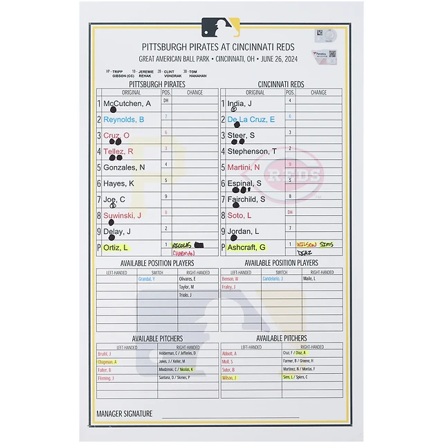 Pittsburgh Pirates Game-Used Lineup Card vs. Cincinnati Reds on June 26, 2024