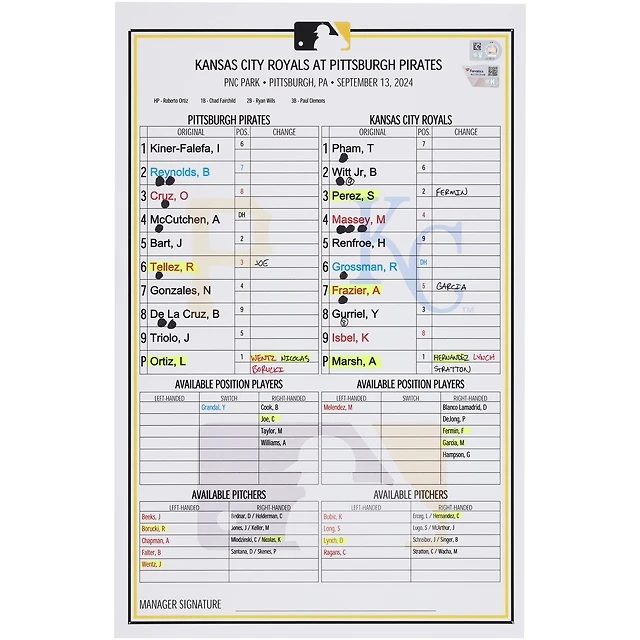 Pittsburgh Pirates Game-Used Lineup Card vs. Kansas City Royals on September 13, 2024