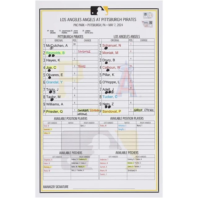 Pittsburgh Pirates Game-Used Lineup Card vs. Los Angeles Dodgers on May 7, 2024