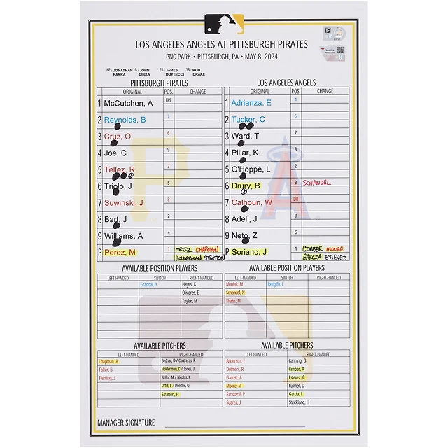 Pittsburgh Pirates Game-Used Lineup Card vs. Los Angeles Dodgers on May 8, 2024