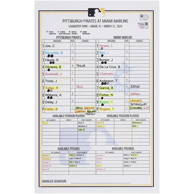 Pittsburgh Pirates Game-Used Lineup Card vs. Miami Marlins on March 31, 2024
