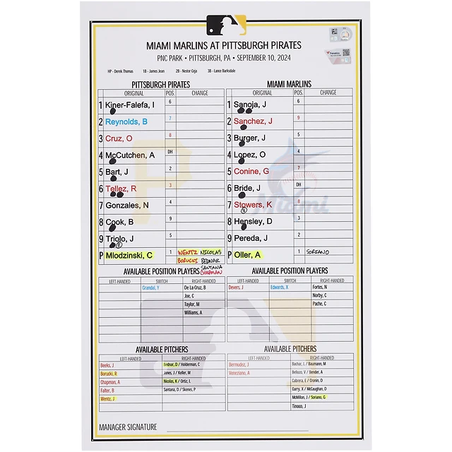 Pittsburgh Pirates Game-Used Lineup Card vs. Miami Marlins on September 10, 2024