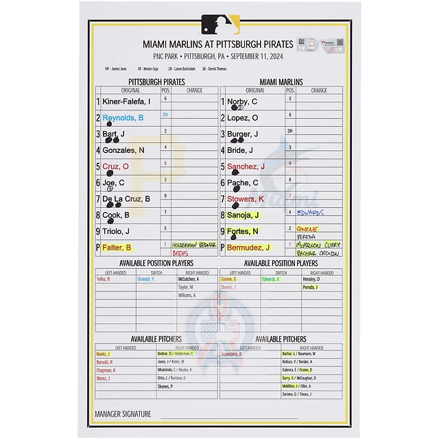Pittsburgh Pirates Game-Used Lineup Card vs. Miami Marlins on September 11, 2024