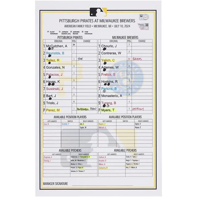 Pittsburgh Pirates Game-Used Lineup Card vs. Milwaukee Brewers on July 10, 2024