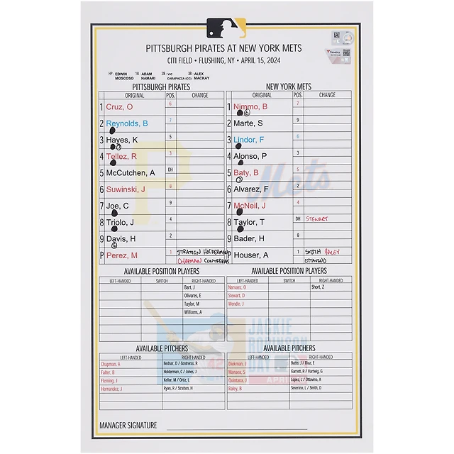 Pittsburgh Pirates Game-Used Lineup Card vs. New York Mets on April 15, 2024