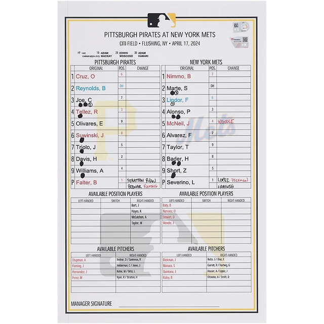 Pittsburgh Pirates Game-Used Lineup Card vs. New York Mets on April 17, 2024