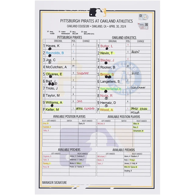 Pittsburgh Pirates Game-Used Lineup Card vs. Oakland Athletics on April 30, 2024