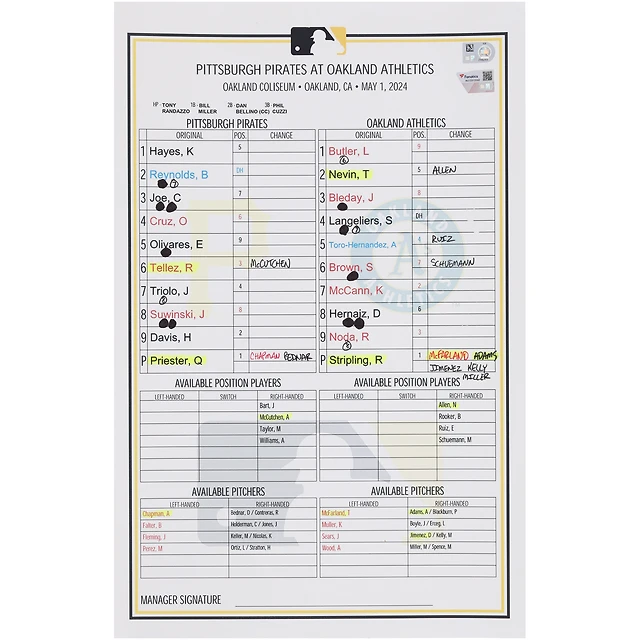Pittsburgh Pirates Game-Used Lineup Card vs. Oakland Athletics on May 1, 2024