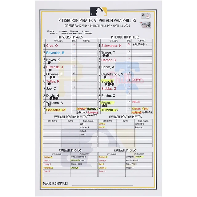 Pittsburgh Pirates Game-Used Lineup Card vs. Philadelphia Phillies on April 13, 2024