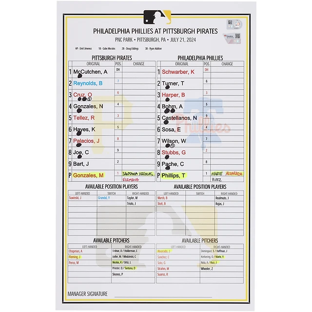 Pittsburgh Pirates Game-Used Lineup Card vs. Philadelphia Phillies on July 21, 2024