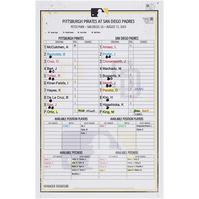 Pittsburgh Pirates Game-Used Lineup Card vs. San Diego Padres on August 13, 2024