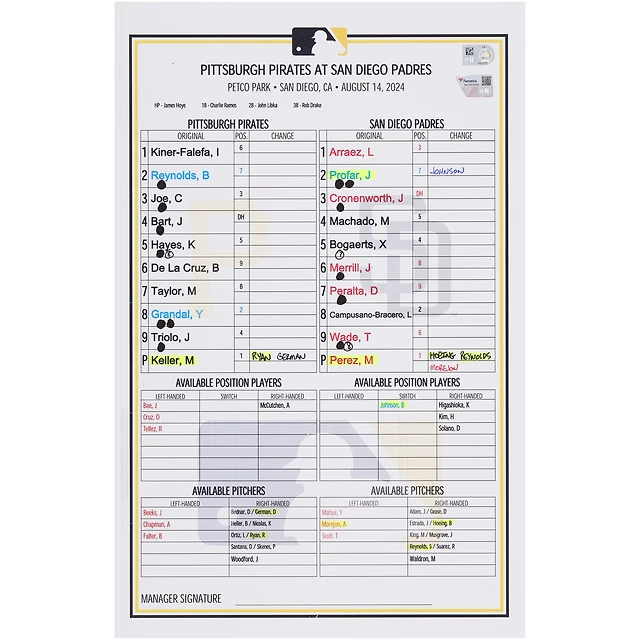 Pittsburgh Pirates Game-Used Lineup Card vs. San Diego Padres on August 14, 2024