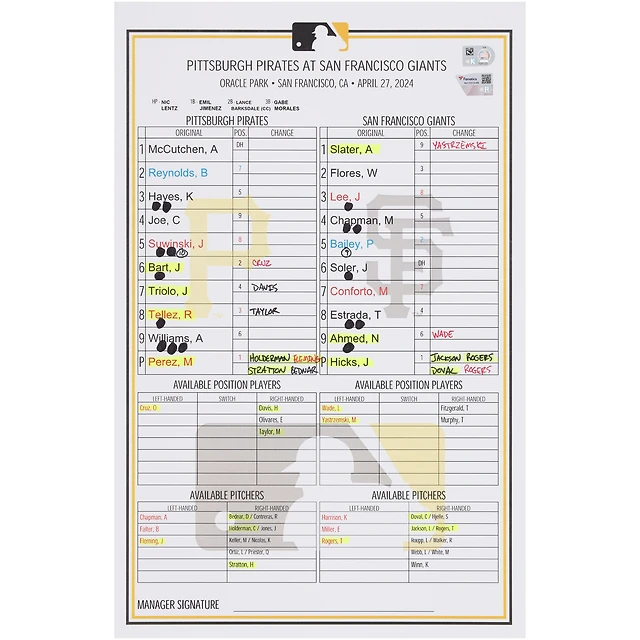 Pittsburgh Pirates Game-Used Lineup Card vs. San Francisco Giants on April 27, 2024
