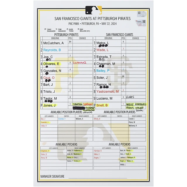Pittsburgh Pirates Game-Used Lineup Card vs. San Francisco Giants on May 22, 2024