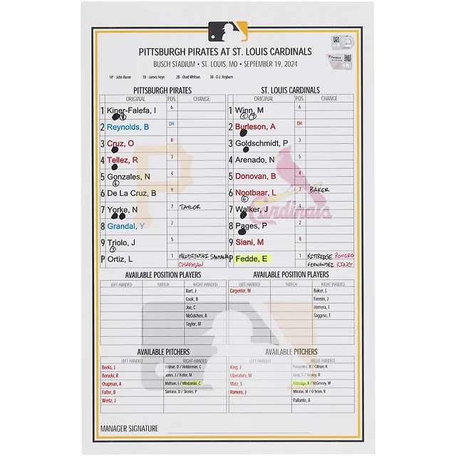 Pittsburgh Pirates Game-Used Lineup Card vs. St. Louis Cardinals on September 19, 2024