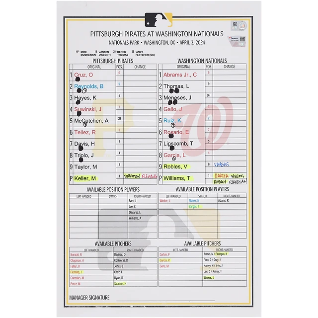 Pittsburgh Pirates Game-Used Lineup Card vs. Washington Nationals on April 3, 2024