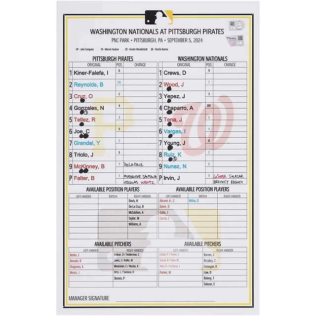 Pittsburgh Pirates Game-Used Lineup Card vs. Washington Nationals on September 5, 2024