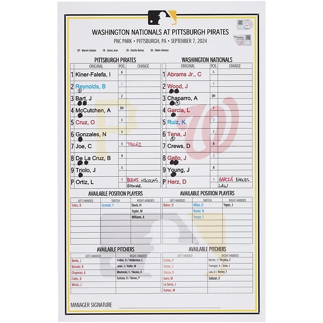Pittsburgh Pirates Game-Used Lineup Card vs. Washington Nationals on September 7, 2024 - Game One of Doubleheader