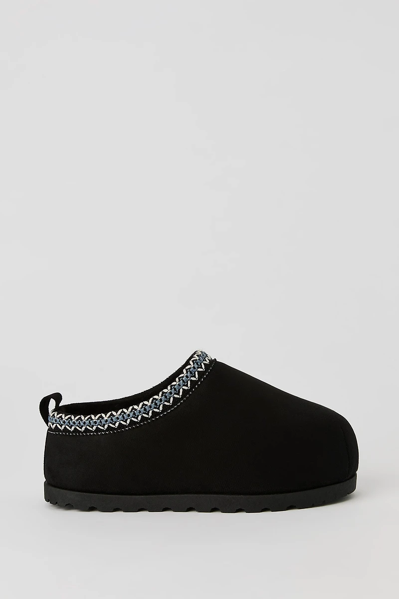 These slipper booties feature faux-suede material, faux-fur lining, embroidered trim, platform sole, pull tab, and slip-on design.