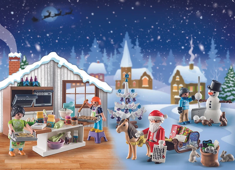 The smell of cookies is in the air! Join in on some holiday fun with the Advent Calendar - Christmas Baking. Behind each of the twenty-four doors lies a surprise piece for each day leading up to Christmas. Once all the pieces are revealed, bake some delicious cookies in the large double-oven kitchen and then put on your hat and gloves before heading outside to build a snowman. A special visitor in a red suit and sleigh may even appear! Create your own cookies with the three full-size cookie cutters and cookie stamp. Set also includes one adult figure, two child figures, Santa, sleigh, snowman, kitchen accessories, and many other holiday decorations. Recommended for ages four to ten years.