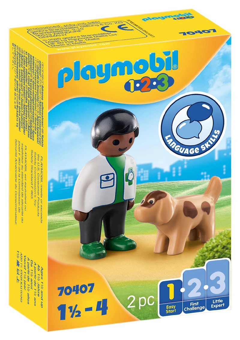 A routine check up for the Vet with Dog is always important! The veterinarian takes care of all the animals. With a bright and colorful design and large, rounded pieces, this PLAYMOBIL 1.2.3 Stage 1 - Easy Start set will help your toddler develop language skills as they learn to identify the pieces. Playset includes a veterinarian and dog. Recommended for ages 18 months to four years.
