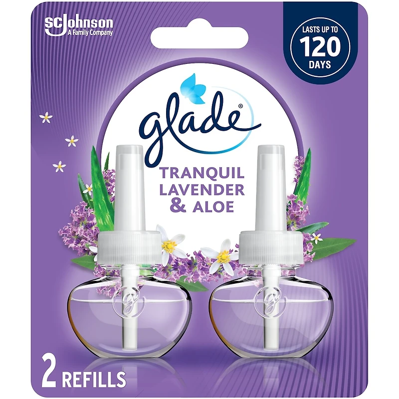 Decorate the air with our Glade Tranquil Lavender & Aloe PlugIns air freshener. Expertly crafted fragrances by master perfumers with notes of lavender, aloe, eucalyptus, and violet petals. Let your air add an extra special personal touch to your decorating with our scent diffuser and change the mood with 2x more adjustability (vs. previous Glade warmer). Express your mood with electric oil diffuser in a variety of fragrances. Simply remove the cap from the refill and insert it into the Glade plug in warmer. Plug the warmer into an outlet and adjust the level of fragrance to create the mood you want. Made without: Phthalates, Formaldehyde, Nitro Musks, Artificial Colors or Dyes