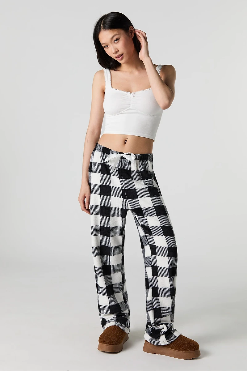 This pajama pant features plush material, all-over print, drawstring waist, and wide leg.