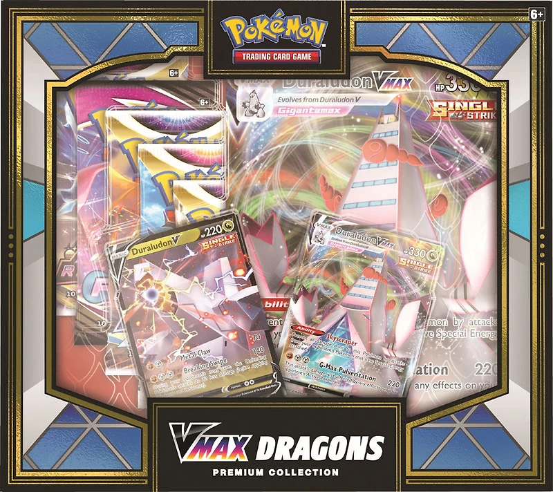 R Exclusive, only available at Toys R Us Canada. A pair of thundering roars pierce the air as Rayquaza VMAX and Duraludon VMAX show off the might and power of Dragon-type Pokémon! With this power-packed set, you can add both of these ferocious Pokémon VMAX to your collection, along with Rayquaza V and Duraludon V for a total of four ready-to-play foil cards! You also get oversize versions of Rayquaza VMAX and Duraludon VMAX for display, plus a huge stack of Pokémon TCG booster packs with even more treasures inside.