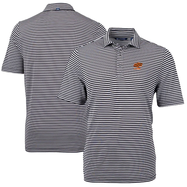 Polo recyclé à rayures écologiques et piqué Virtue pour homme, noir, avec logo des anciens Cowboys de l'Oklahoma State, Cutter & Buck