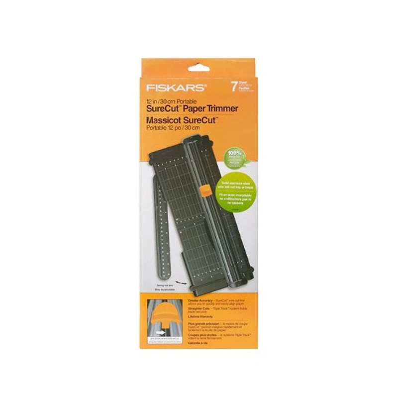 This portable paper trimmer includes everything you need to make your next scrapbooking project possible. The patented TripleTrack™ System interlocks the blade and rail for straight, precise cuts every time. It can even handle extra-large scrapbook pages with precision—a swing-out arm extends the measuring deck to a full 15 1/4". An aluminum cutting surface and reference guides ensure superior precision. Best of all, a lightweight design makes it easy to take this trimmer to your next scrapbooking event.Features a 30 cm (12 in) cut capacity