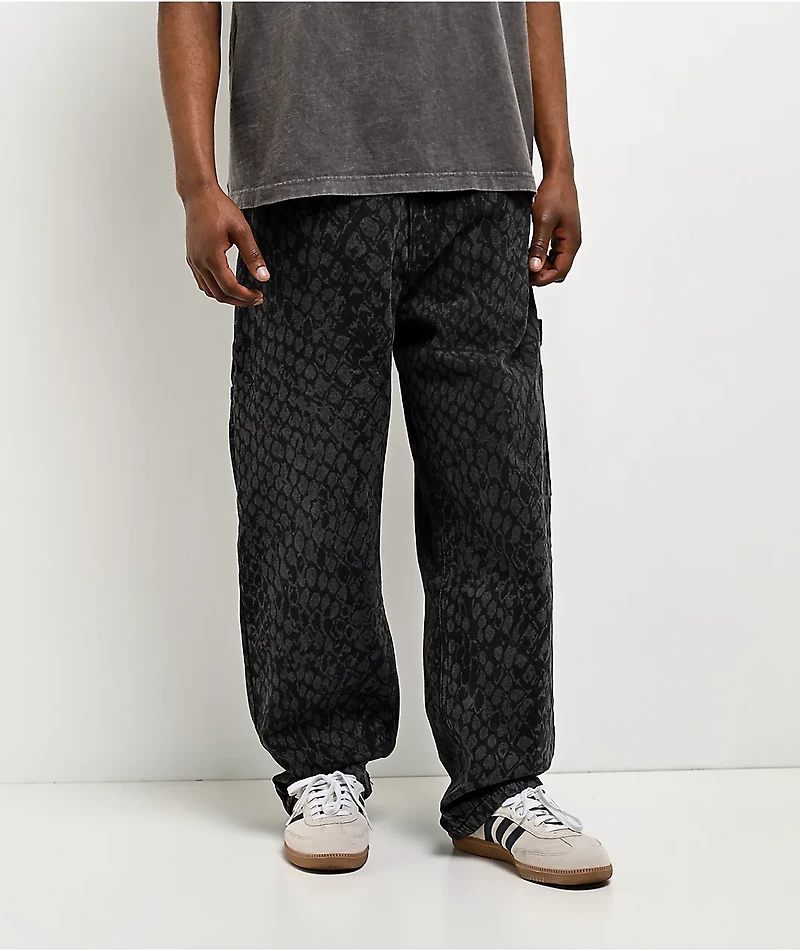 Primitive Skateboards brings a patterned finish to the Scales carpenter pants in a grey colorway. The carpenter silhouette keeps the fit familiar and comfortable. The textured snakeskin design adds visual interest without overpowering the pants.