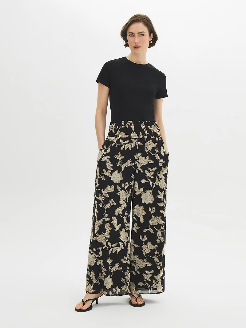Elegant and breezy, these playful palazzo pants feature a vibrant print and a lightweight chiffon fabric for a comfortable and stylish look. Perfect for adding a breezy layer to your warm-weather outfit or for adding a vibrant pop to your casual attire.Woven chiffon pants Wide smocked waistband Animal print High-rise Wide leg Side pockets Pull-on 29" inseam Model is wearing size XS Fabric: 100% polyester Lining: 100% polyester Machine wash inside out in cold water Hang to dry
