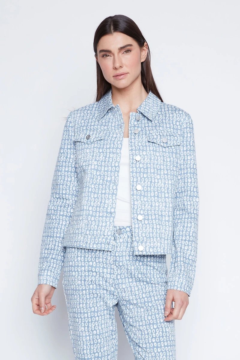 Elevate your denim game with this charming jacket from Alison Sheri! Crafted from a comfortable cotton blend, it features a classic shirt collar, button-front closure, and practical flap pockets for everyday functionality. The print adds personality to any outfit, while the long sleeves provide versatile layering. Available in both Petite and Regular fits, this jacket is designed to flatter and move with you. Perfect for casual outings or dressing up your favorite jeans.  Co-ordinate with style A47179C.