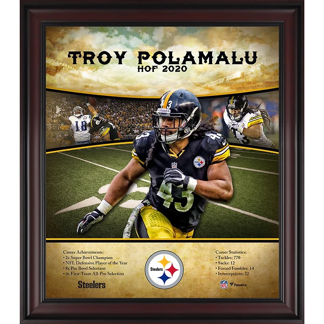 Profil de carrière du Temple de la renommée des Steelers de Pittsburgh, Troy Polamalu, encadré 15" x 17"