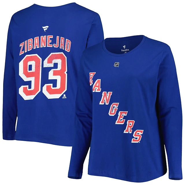 Profil femme Mika Zibanejad T-shirt à manches longues bleu New York Rangers grande taille avec nom et numéro imprimés en détresse