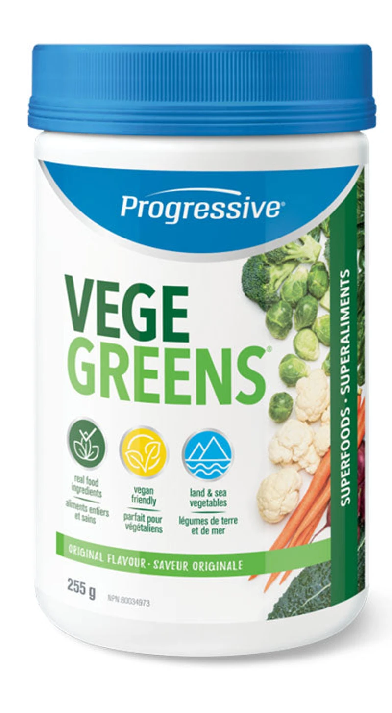Increases energy & renews mental clarityHelps to cleanse your body, strengthen immunity & balance pHSupports your heart, liver and digestive healthA combination of over 60 ingredientsProfessionally formulated and bioenergetically testedDescriptionPROGRESSIVE - VegeGreens - 255 Gram(s) - NPN: 80034973 -- The Ultimate Super FoodVegeGreens is a comprehensive combination of over 60 land, sea and cruciferous vegetables, as well as super green foods, plant oils, phytonutrients, herbs & extracts and botanicals. With 8 distinctive blends of green foods and plant extracts, VegeGreens supplies an extraordinary spectrum of nutrients ranging from the rare trace minerals found in sea vegetables to the health-enhancing compounds exclusive to cruciferous vegetables. Each small scoop provides the nutrient equivalent of 6 to 8 servings of fresh vegetables