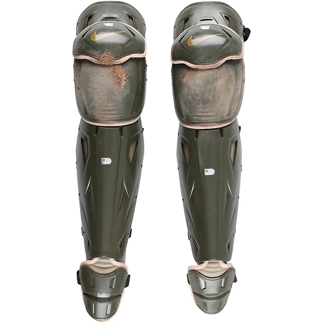 Protège-tibias Nike verts de J.T. Realmuto, utilisés lors du match des Phillies de Philadelphie contre les Nationals de Washington, le 18 mai 2024