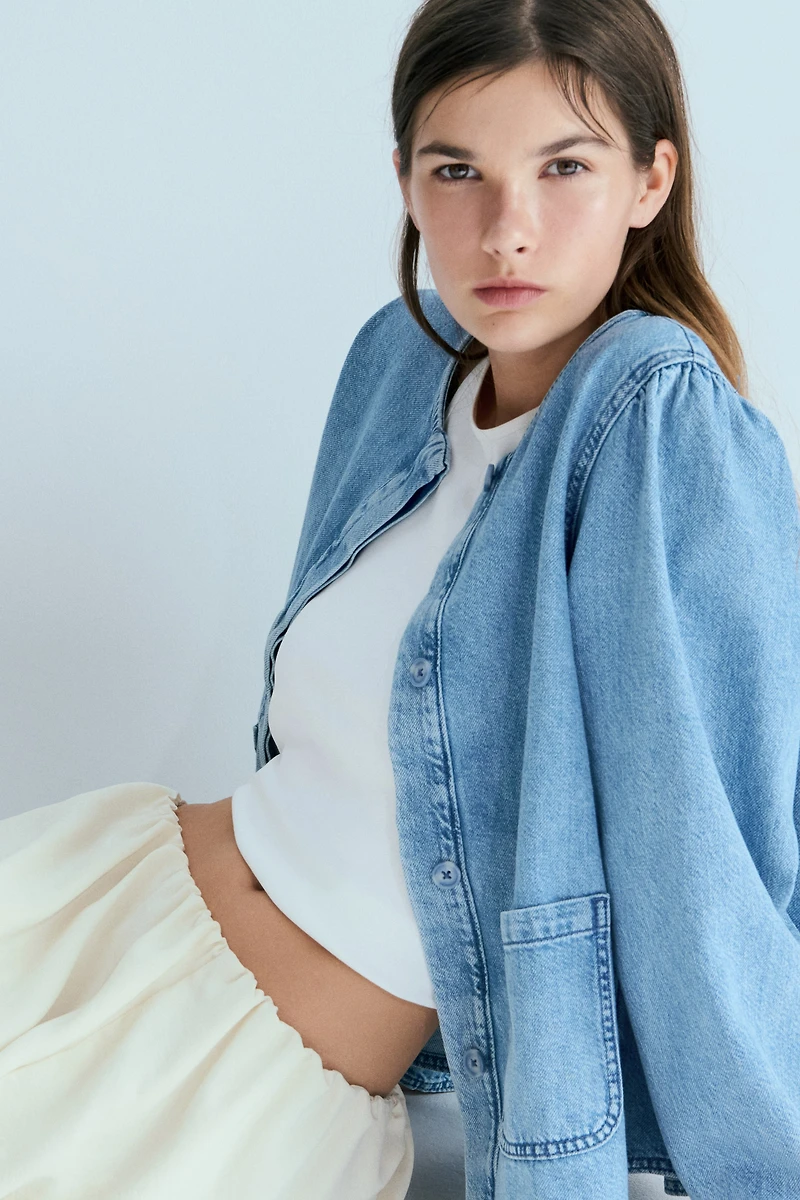 Jacket in rigid cotton denim. Round neckline, concealed buttons at front, a gathered yoke at back, and patch front pockets. Long puff sleeves.