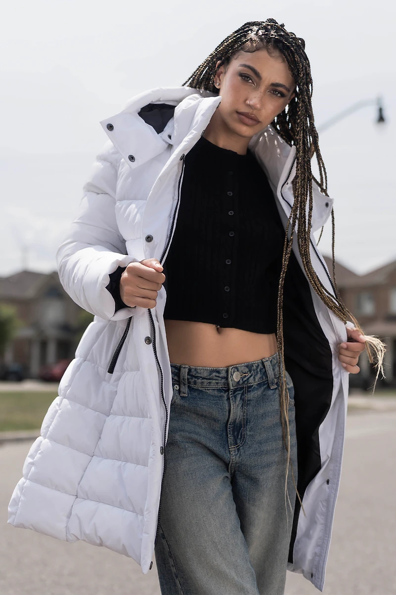 This parka features soft polyester fill, removable hood, 2-way zip-up snap button front, storm cuff, fleece lined zippered pockets, mock neck, long sleeves, and mid length.