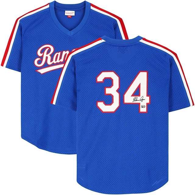Pull d'entraînement au bâton autographié Royal Mitchell & Ness de Nolan Ryan Texas Rangers