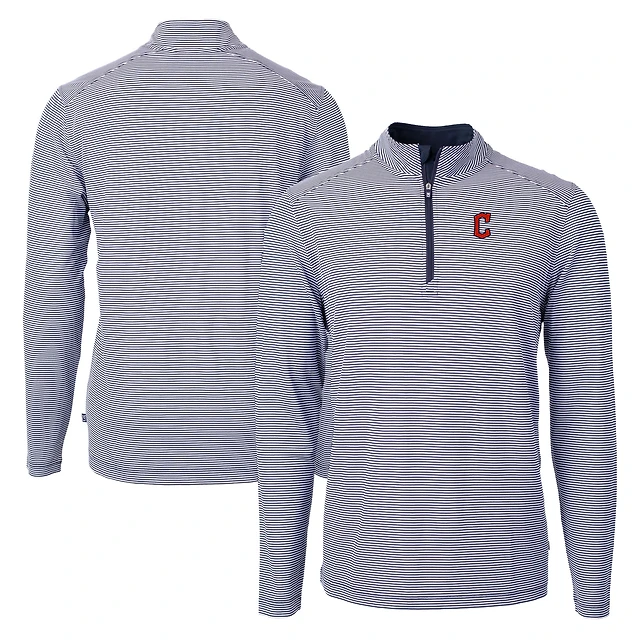 Pull-over zippé quart de tour en piqué écologique à micro-rayures pour homme, bleu marine/blanc, des Cleveland Guardians, Cutter & Buck, couleur grande taille et recyclé.