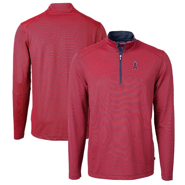 Pull-over zippé recyclé à micro-rayures et col rond pour homme, couleur rouge/bleu marine, des Los Angeles Angels, de Cutter & Buck, en piqué écologique, grande taille.