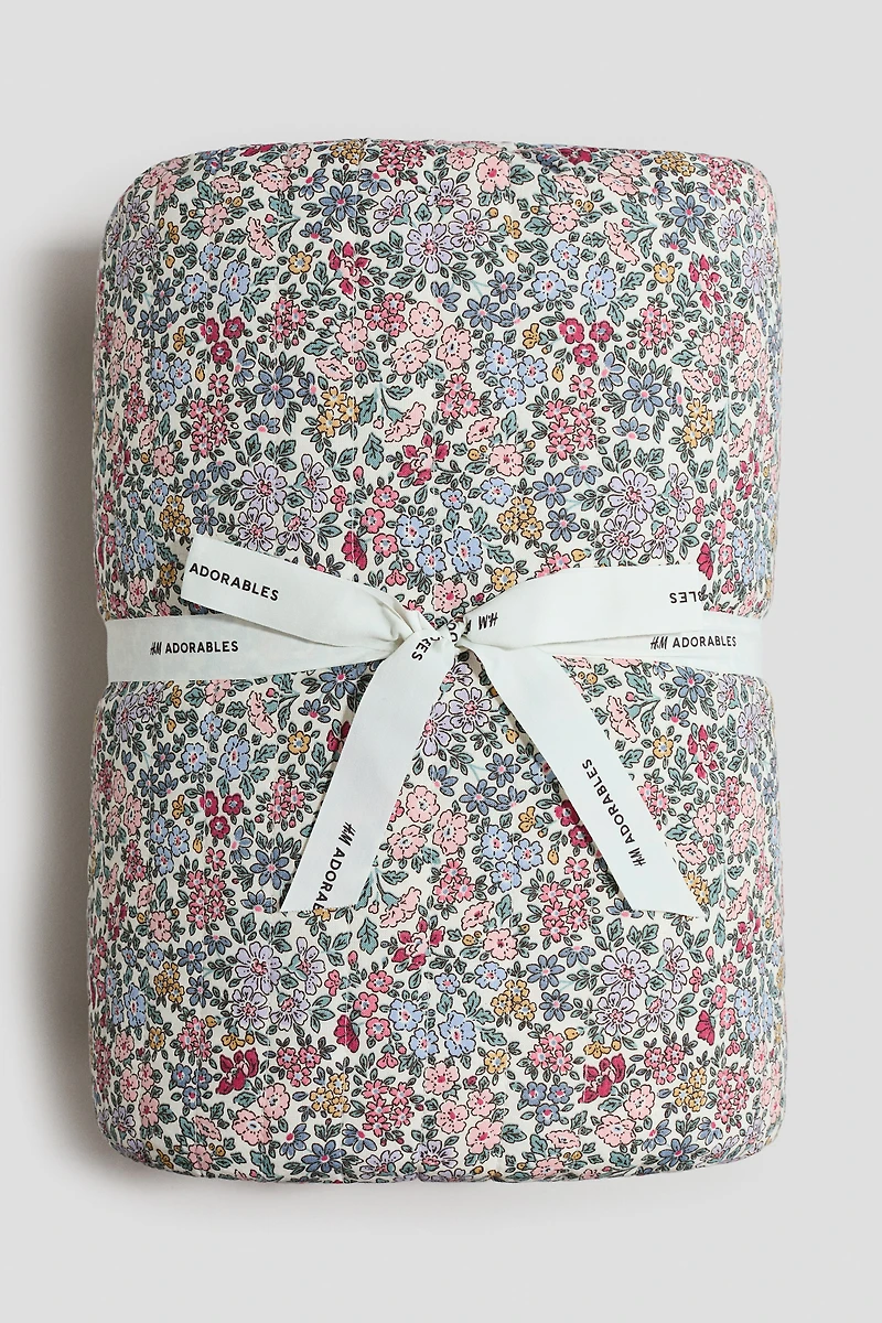 Padded twin bedspread in quilted woven cotton with a floral pattern.