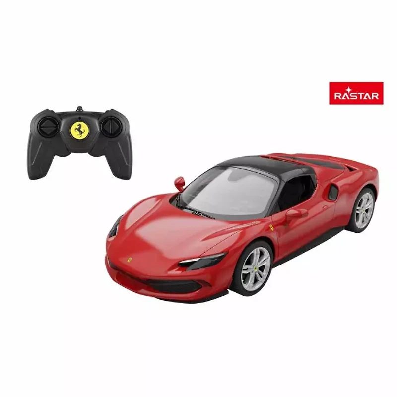 This red Ferrari 296 GTS has an authentic design, an injection molded body and an independent suspension system. The car can drive forward, reverse and turn left and right, has bright headlights and a transparent windshield. From 6 years old.
