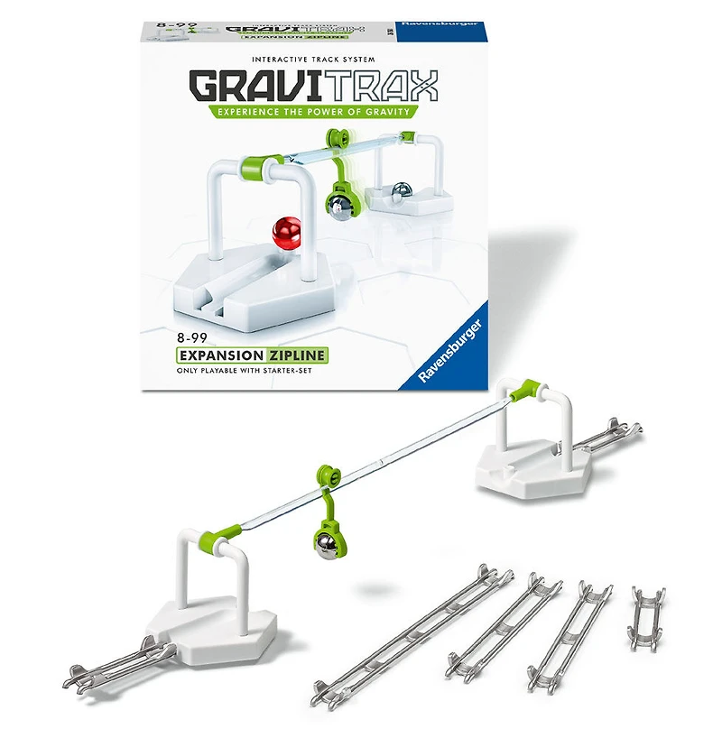 Zip along! The Zipline connects track sections to overcome long distances and varying elevations. Combine the Zipline with the GraviTrax Starter-Set for spectacular gliding action. How far will your marbles go when connected across the tracks via Zipline?
