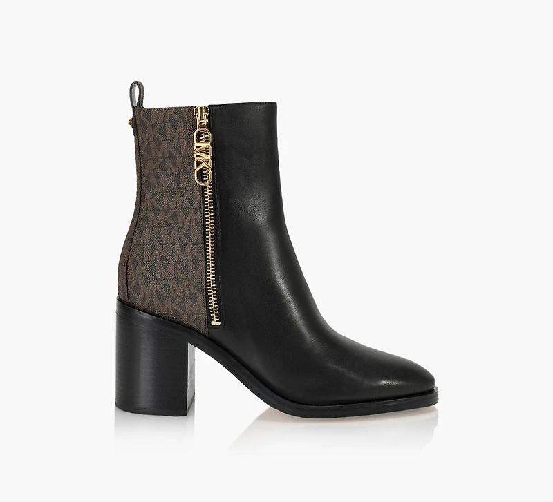 Michael Kors’ iconic two-tone Regan line, now with a stacked heel. The form fitting Regan Mid Bootie has hints of the Chelsea silhouette, but its arch and mid-rise heel add some glamour to an otherwise timeless look. Finished with signature MK hardware for flair.