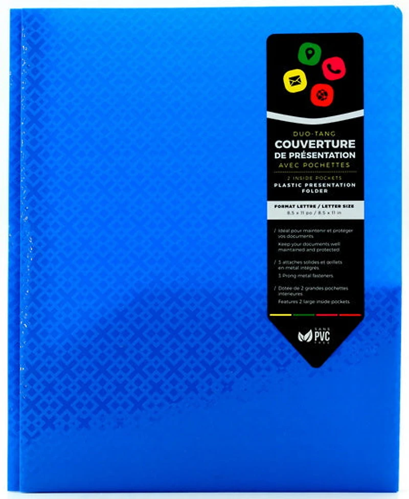Duo-tang avec pochettes Idéal pour maintenir et protéger vos documents. 3 pochettes solides et œillets en métal intégrés. Dotée de 2 grandes pochettes intérieures.