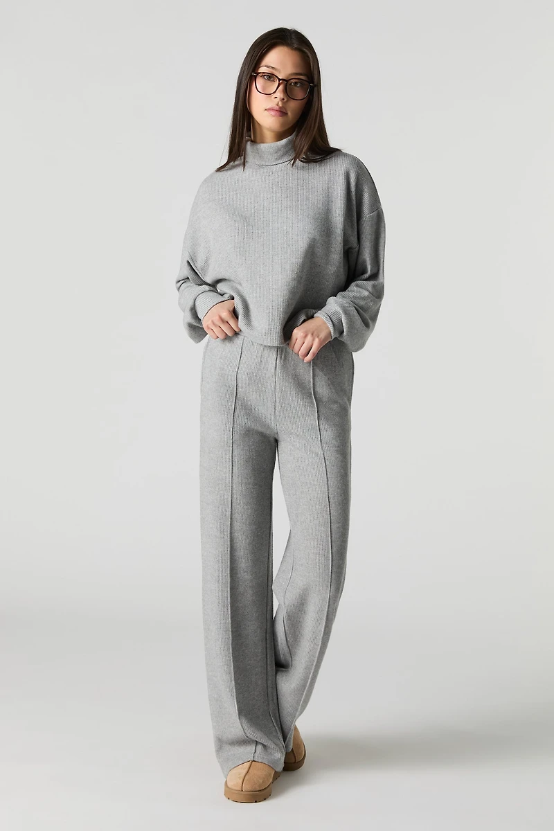 This pant features ribbed knit material, elastic waist, pintuck detail, pockets, and wide leg. Pair with our Ribbed Knit Turtleneck Sweater to complete the look.